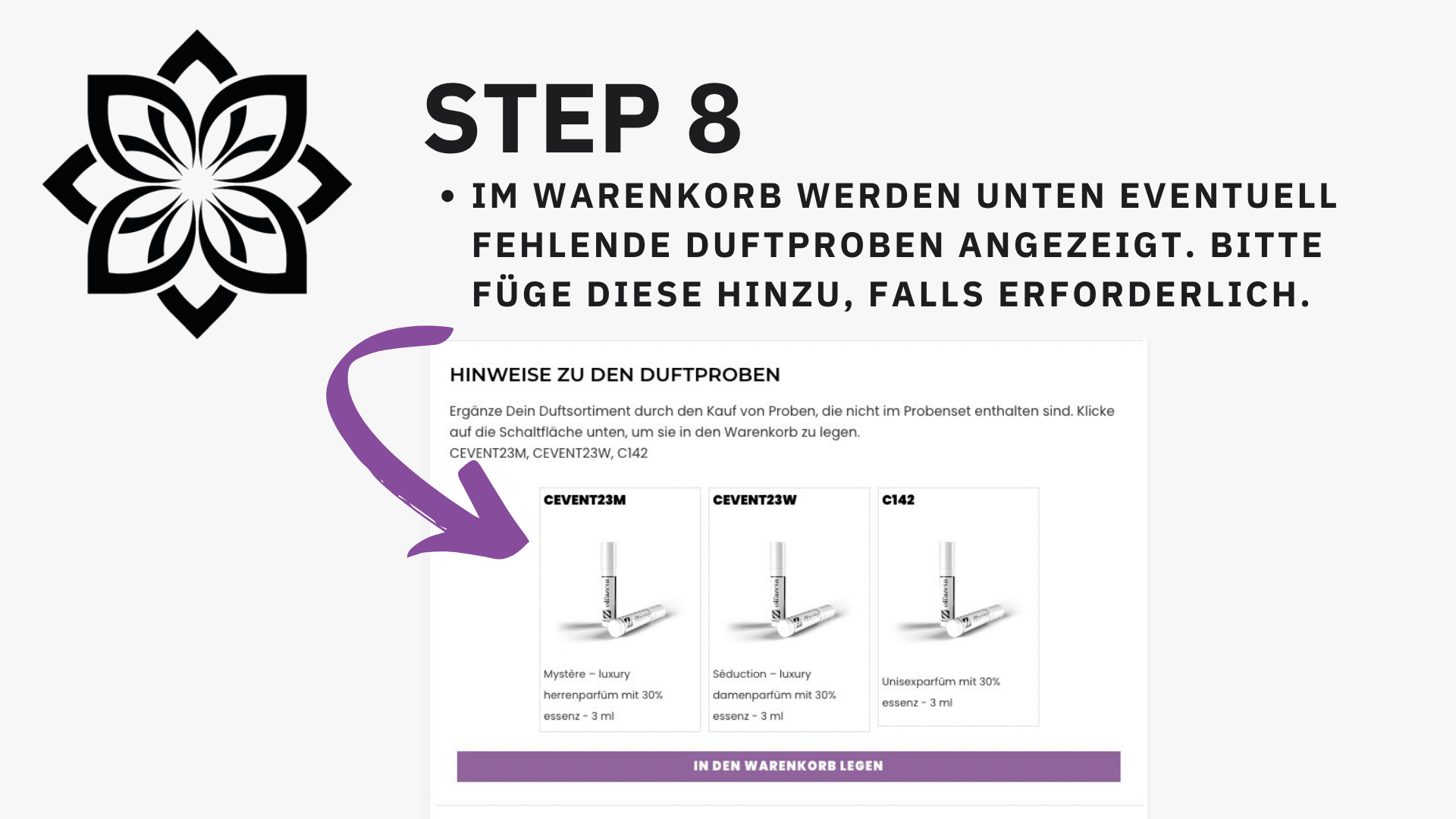Im Warenkorb siehst du die neuen Duftproben. Wir erweitern kontinuierlich unser Sortiment. Bitte füge die neuesten Düfte hinzu.