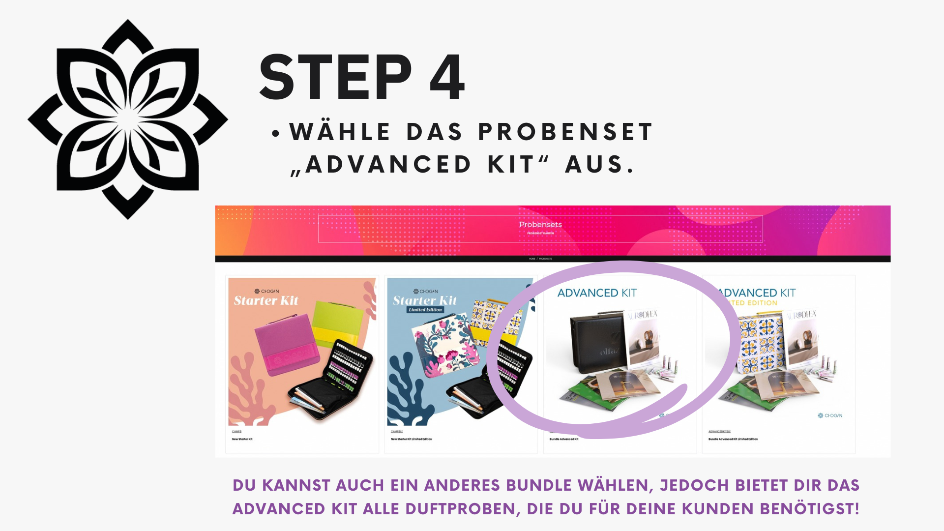 Wir empfehlen das Advanced Kit mit über 135 Duftproben. Deine Bestellung muss mind. 100 Punkte erreichen um den Berater Status zu aktivieren!